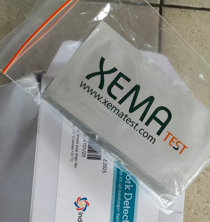 Xema® Pork Detection Kit ini adalah alat uji kualitatif yang digunakan untuk menguji kandungan babi pada suatu makanan atau permukaan alat pemotong seperti pisau. Rapid test ini sangat mudah digunakan dan hasilnya dapat diperoleh dalam waktu singkat, oleh karena itu proses pengambilan sampel dan pengujian dapat dilakukan di waktu yang sama hingga mendapatkan hasil hanya dalam beberapa menit. Hasil pemeriksaan terhadap sampel daging sapi giling yang diuji, menunjukkan hasil negatif, yang artinya pada sampel tidak tercemar oleh daging babi, yang ditandai dengan munculnya garis 1 (satu) pada alat test kit-nya yang menandakan sampel negatif.